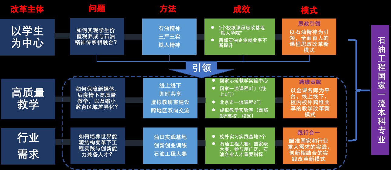 在石油工程国家一流专业建设与实践中,开展了思政引领、跨维共享、践赛合一的石油工程国家一流专业建设与实践。通过思政引领,融合课程思政于课堂及实践教学,形成石工专业三全育人的新局面;通过跨维共享,构建了线上线下即时共享的课堂教学模式,打造了以“金课”为引领的一流课程群,探索了跨越高校、企业和行业协会的育人管理机制;通过践赛合一,融合“虚拟仿真”的线上实践教学和“真油、真水、真设备、真操作”工科实践基地教学;依托“中国石油工程设计大赛”和“大学生创新创业训练计划”,形成创新能力和工程实践育人模式。以石油精神为引领,全面育人的课程思政改革新模式,以金课名师为平台,线上线下、校内校外跨维共享的教学改革新模式,瞄准国家和行业重大需求的实践、创新相结合的“践赛合一”实践改革新模式,对工科领域“三全育人”和“德智体美劳”社会主义事业接班人的培养开创了一条蹊径。