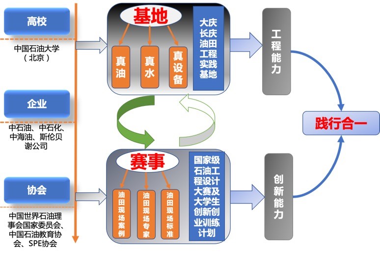突破校企、学科界限,中国石油大学(北京)联合中石油、中石化、中海油、斯伦贝谢公司、世界石油理事会国家委员会、中国石油学会、中国石油教育学会等核心企业、协会并依据各自行业特点建设了若干校级、国家级践赛教育平台。建立了多学科交叉的学校教师与现场培训教师组合式工程实践教学团队,结合虚拟仿真设备,形成“真油、真水、真设备、真操作”的生产实践内容体系。采用四步实训教学法,巩固实习训练的教学成效。依托“中国石油工程设计大赛”和“大学生创新创业训练计划”,将能源安全保障与行业人才培养相结合,“以赛促学”,“以赛代练”,“学研赛用”形成了学生自主学习、自主创新的良好局面。
