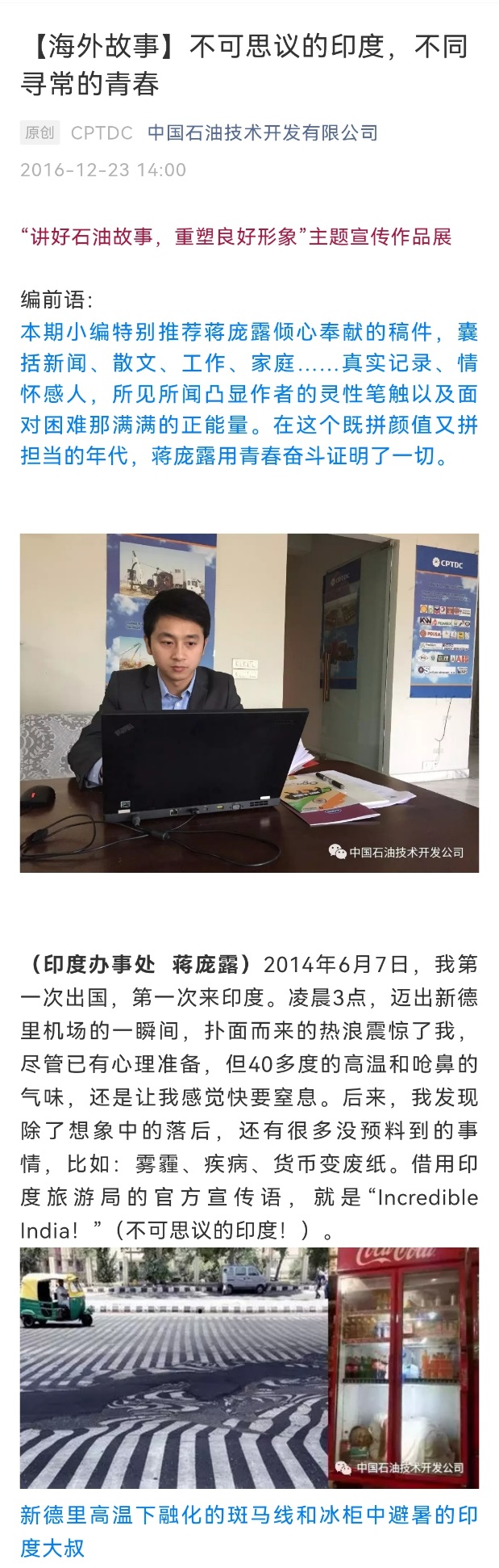 (4)蒋庞露 《不可思议的印度,不同寻常的青春》—就职于中国石油技术开发有限公司
