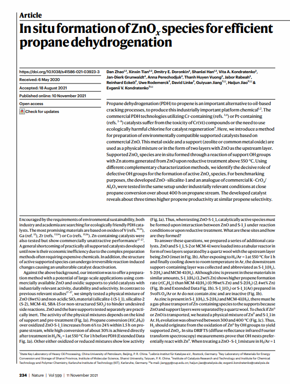 研究结果以“In situ formation of ZnOx species for efficient propane dehydrogenation”(原位形成ZnOx物种用于丙烷高效脱氢)为题, 于2021年11月10日在《自然》(Nature)在线发表。中石大博士研究生赵丹为本论文的第一作者,赵丹博士于2018年受国家留学基金委创新型国际合作培养项目资助赴德国莱布尼兹催化研究所联合培养,现为莱布尼兹催化研究所博士后。