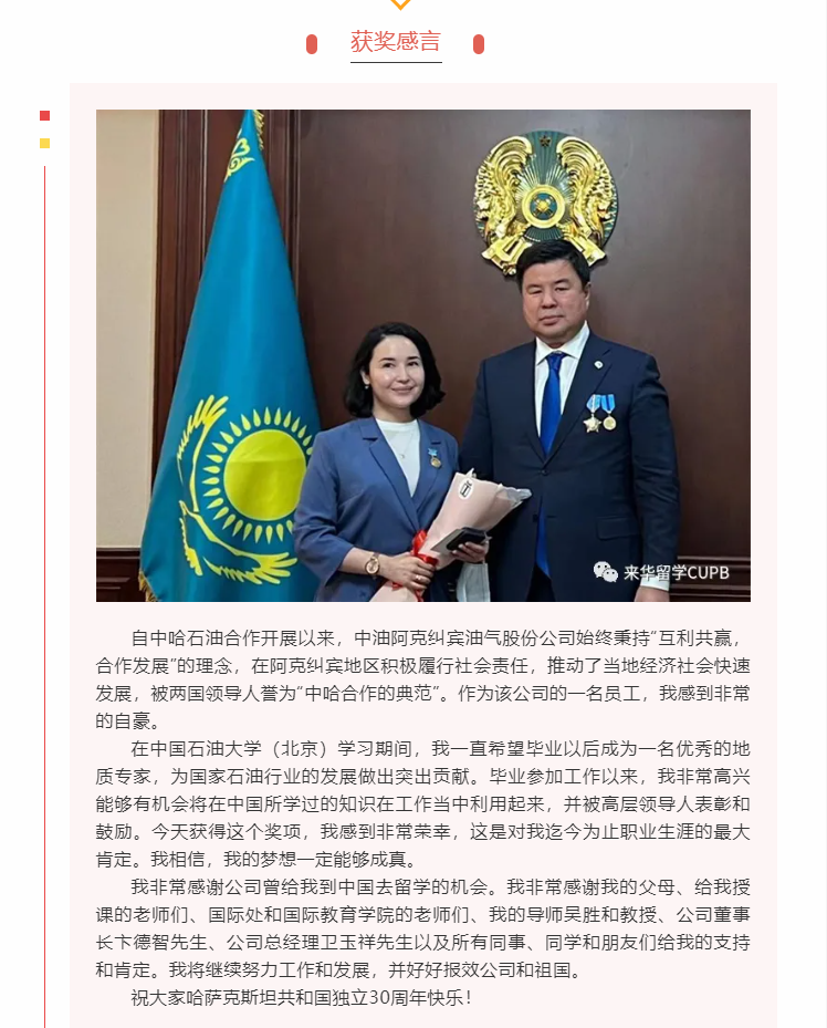 3.2 优秀校友秘拉—获哈萨克斯坦能源部油气行业杰出贡献奖