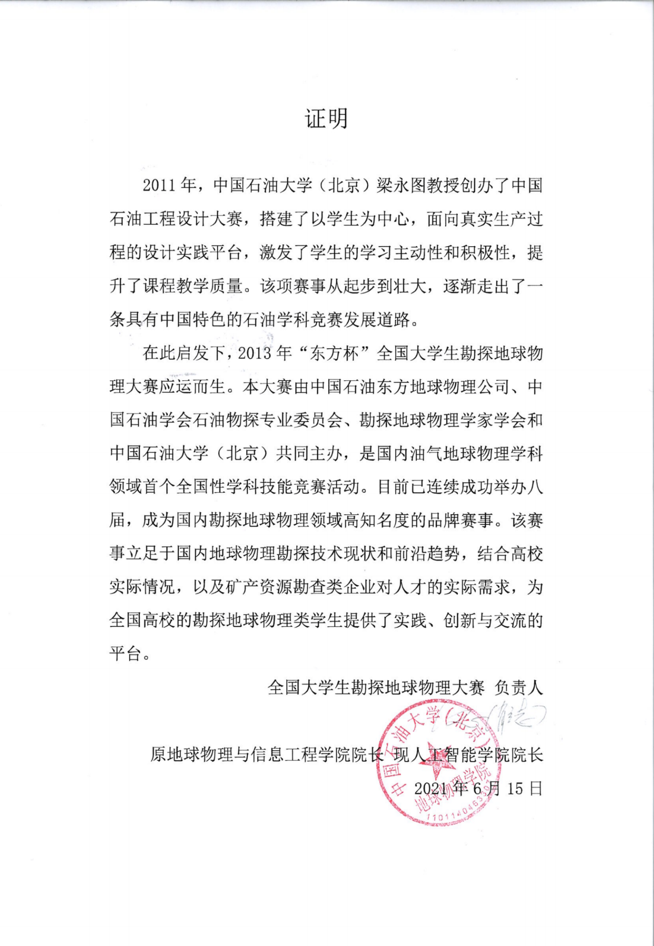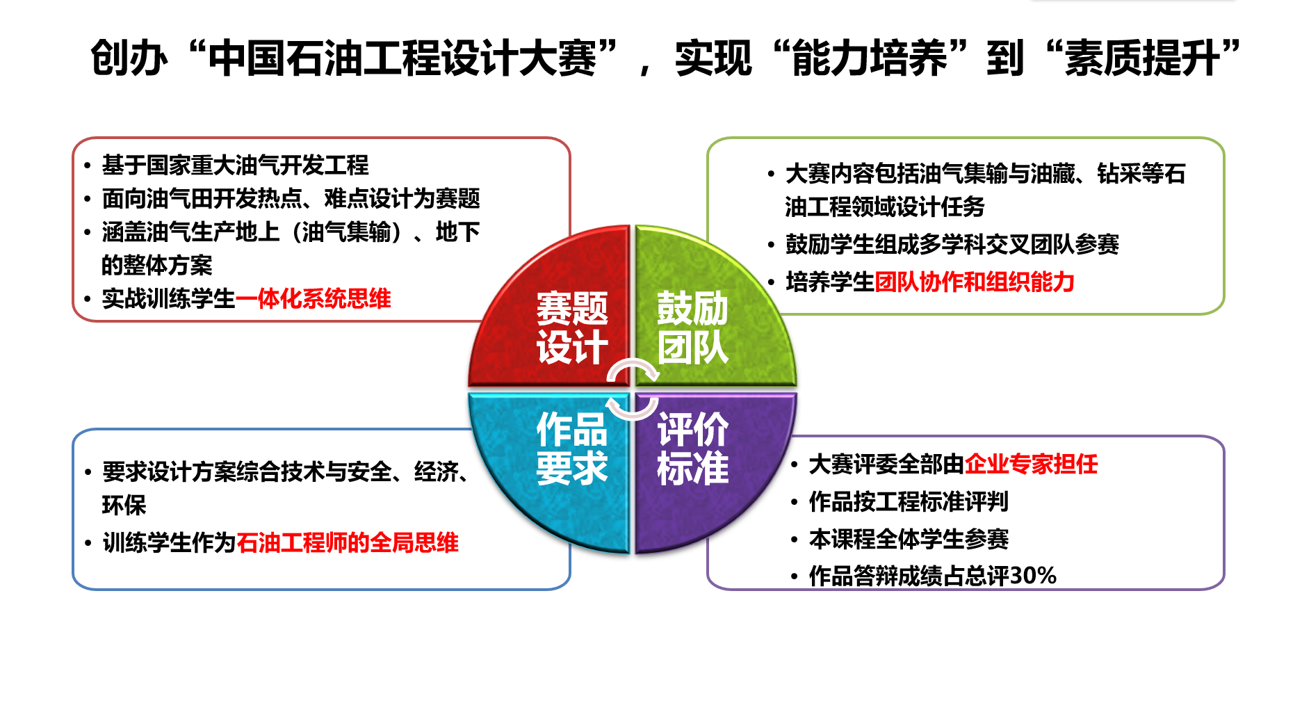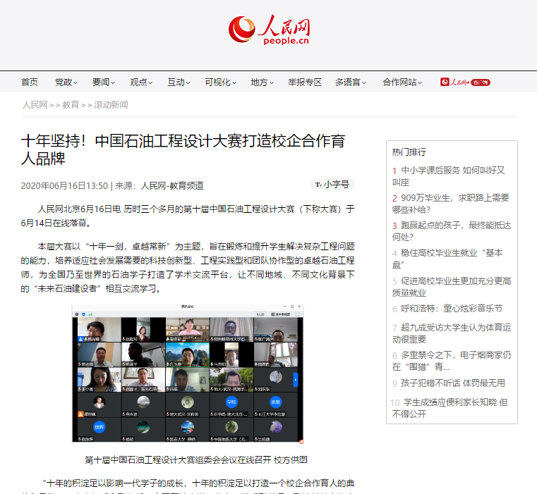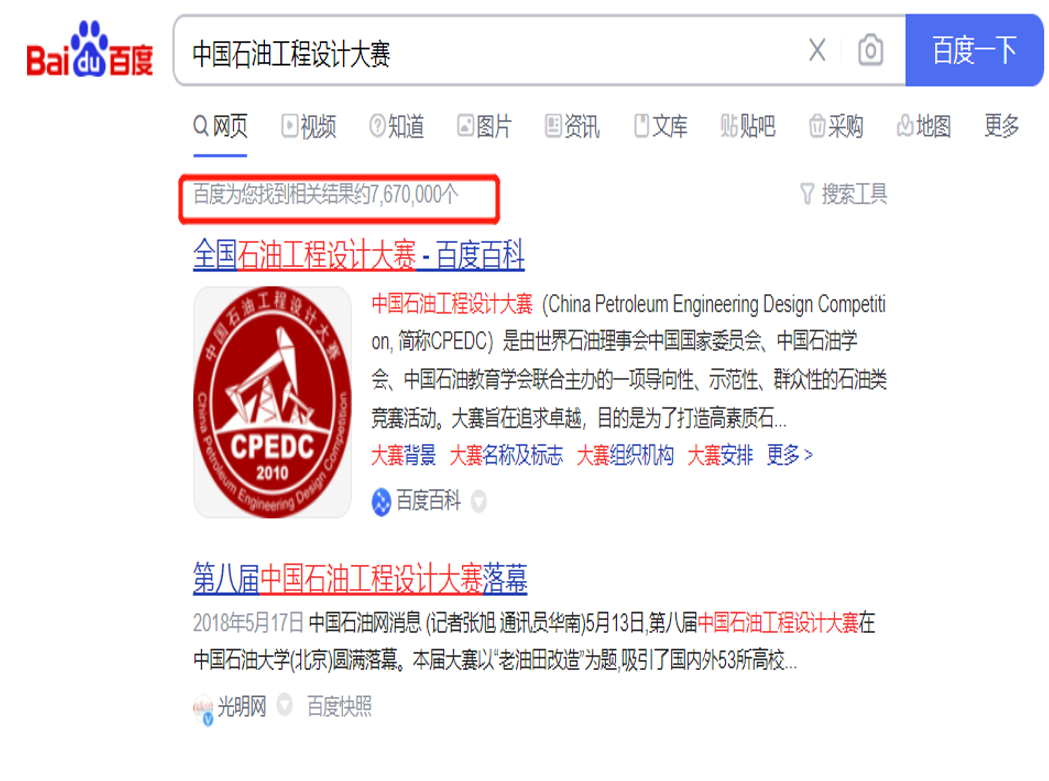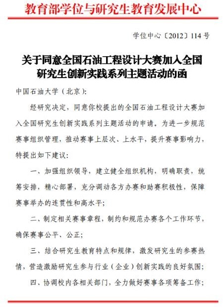 “中国石油工程设计大赛”已成功举办十一届,引领了“全国大学生勘探地球物理大赛、中国研究生能源装备创新设计大赛、全国大学生能源经济学术创意大赛、全国油气地质大赛、全国能源翻译大赛、全国大学生油气储运工程设计大赛、中国海洋工程大赛”共7个学科赛事的创办。