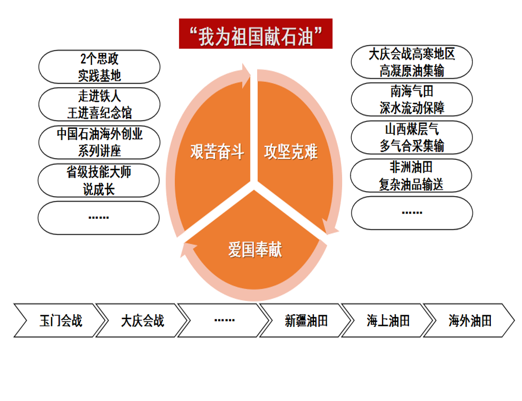 依托课程涉及的油气开发时代背景和行业特色,结合玉门会战、大庆会战到新疆油田、海上油田、海外油田等我国各时期油气开发和集输技术发展历程,通过教学内容与工程技术案例有机结合,将“艰苦奋斗、攻坚克难、爱国奉献”的石油精神融入课程教学,使学生在学习专业技能的同时,体会“我为祖国献石油”的深刻内涵,自觉“把个人的理想追求融入到党和国家事业之中”,落实总书记给我校克拉玛依校区毕业生回信的殷殷嘱托。