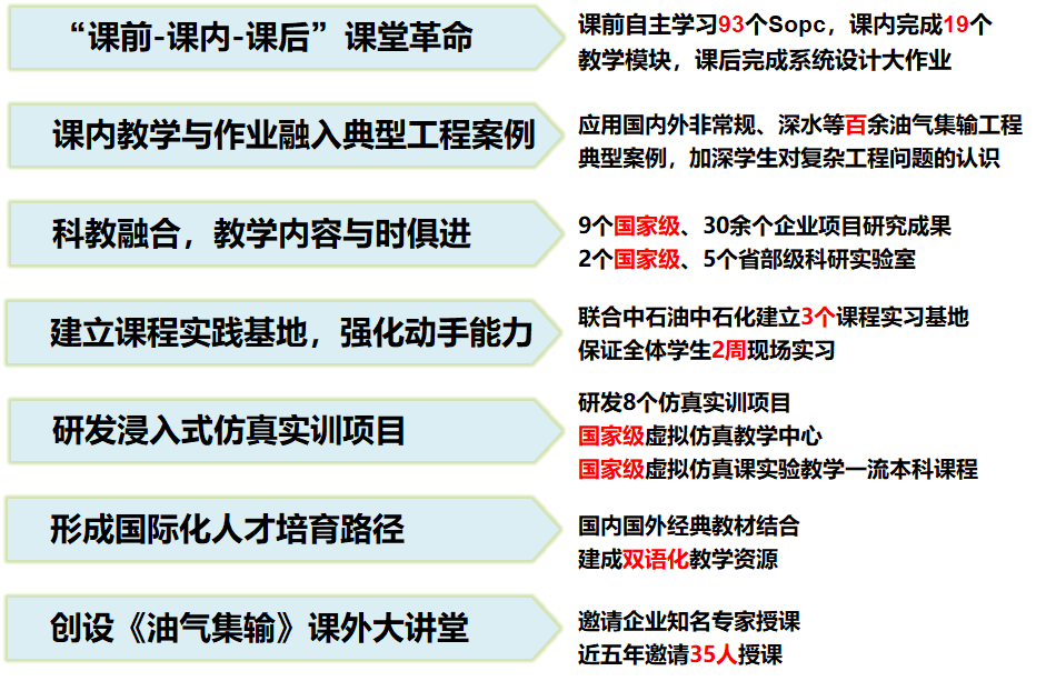 ③科教融合,教学内容与时俱进:以国家科技重大专项“海洋深水管道流动安全保障”等9个国家级、26个企业项目研究成果充实教学内容;本专业2个国家级、5个省部级科研实验室用于课程综合性实验。