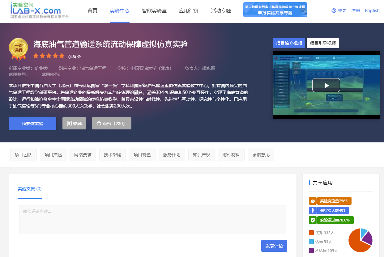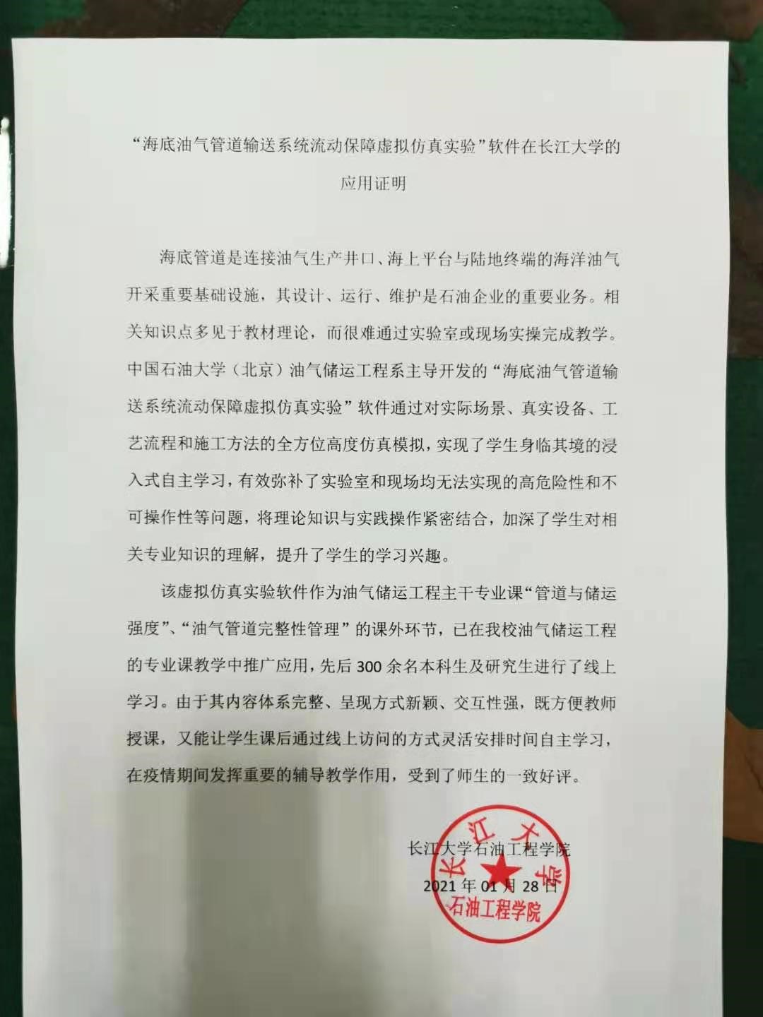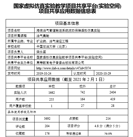 “国家级虚拟仿真教学中心”被推广应用到北京石油化工学院等7所高校;入选的国家级虚拟仿真实验教学一流本科课程“海底油气管道输送系统流动保障虚拟仿真实验”,仅2020年就支持了本校和27所其他高校共计742名师生在线学习。