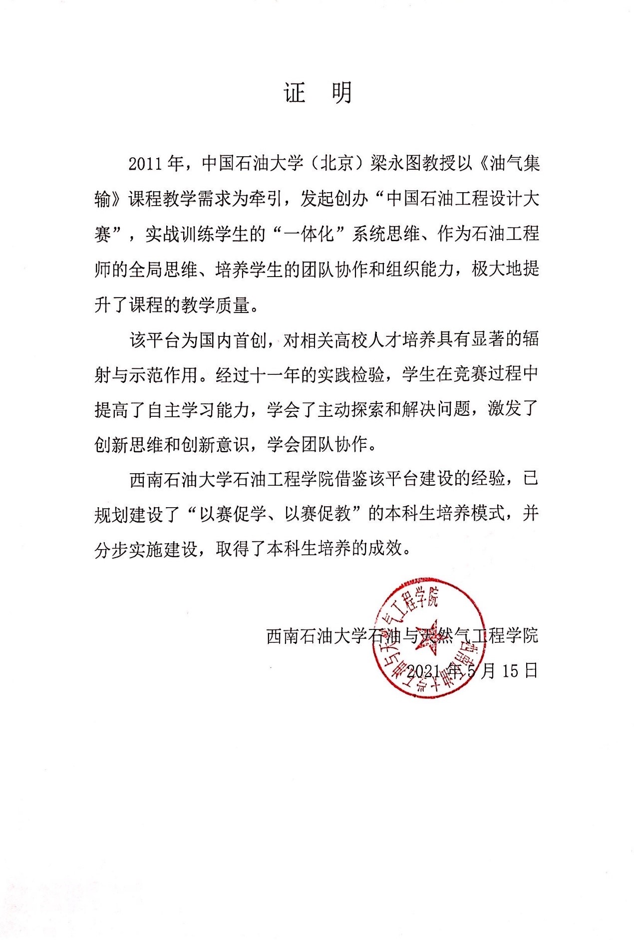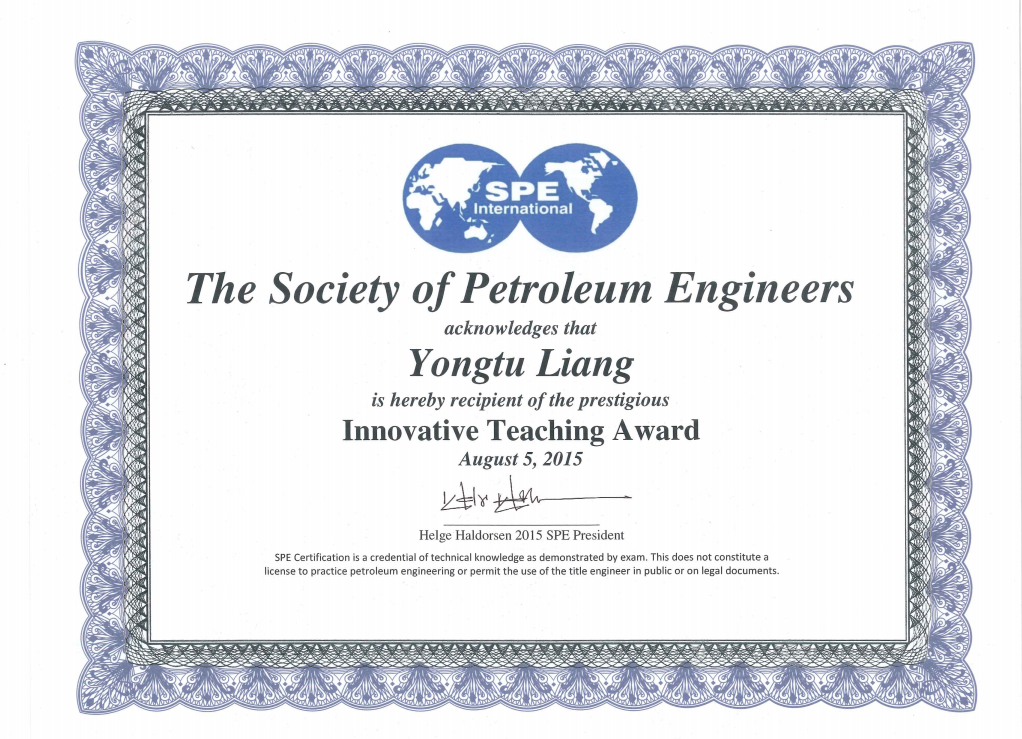 以学生喜闻乐见的“大赛”这一课程教学创新形式,让学生在传统教学环节外,获得面对真实工程问题“真刀真枪上战场”的体验,促进学生自觉从应试学习转变为能力培养、素质提升。“大赛”设置油气开发整体方案赛题,训练学生“油气田生产地下地上一体化”系统思维;要求学生组队参赛,培养学生团队协作意识和组织领导能力;要求参赛作品涵盖HSE和经济评价,强化学生作为石油工程师的全局思维。“大赛”创始人梁永图教授获“国际石油工程师协会全球创新教学奖”(2015年以来亚洲唯一)。已成功举办十一届,累计吸引北京大学等45所国内高校、美国斯坦福大学等27所国外高校3万余名学生参赛,被誉为石油教育界的“奥林匹克”。