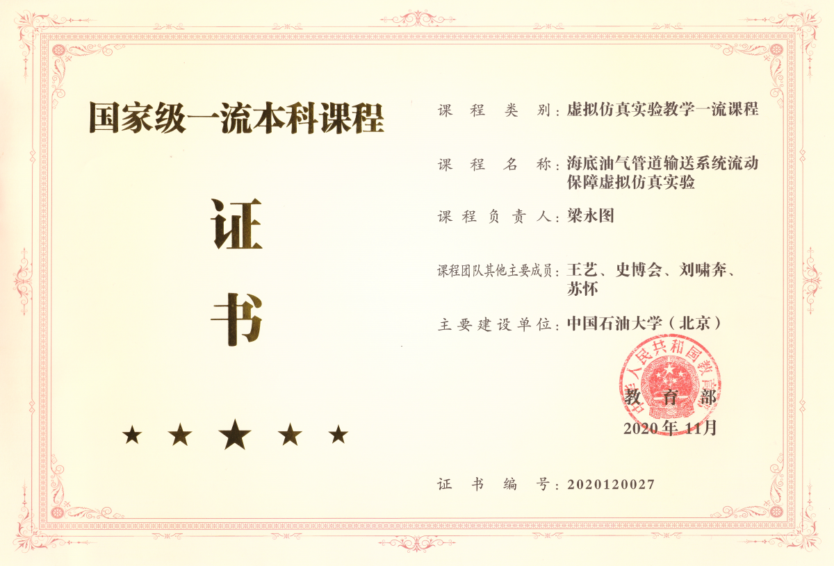 ⑤研发8个仿真实训项目,建成“国家级虚拟仿真教学中心”和国家级虚拟仿真实验教学一流本科课程“海底油气管道输送系统流动保障虚拟仿真实验”,为学生提供体验和处理各种复杂难题的场景。
