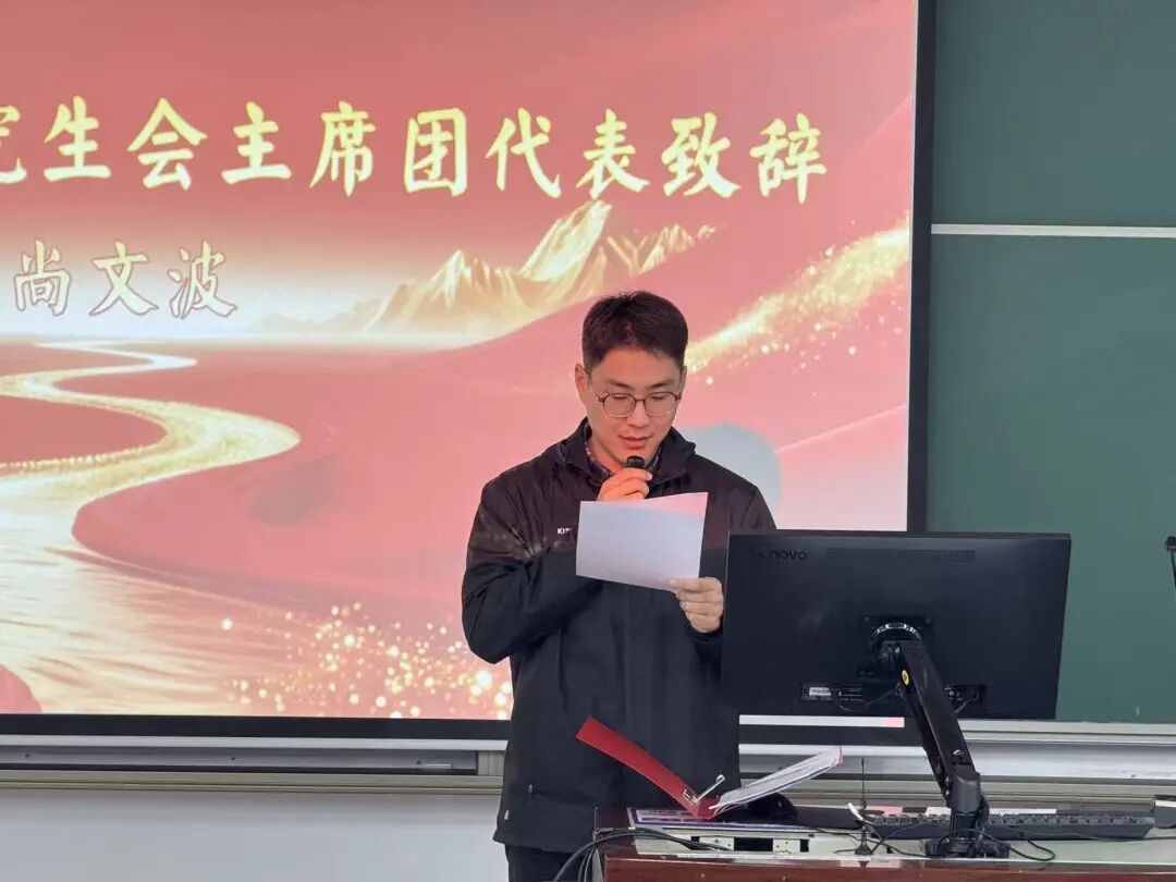 第二十五届研究生会主席团代表尚文波发言。他首先对化学工程与环境学院第二十六届研究生会的成立表示祝贺,并分享了自己在研究生会工作过程中的经验与思考。他指出,研究生会是学生工作的重要支撑,希望新一届研究生会未来能在学术交流、就业帮扶、文化建设等领域开展丰富活动,为化院研究生们创造更优质的成长环境。同时,他也祝愿化院研会在新一届主席团带领下,展现新作为、实现新突破。