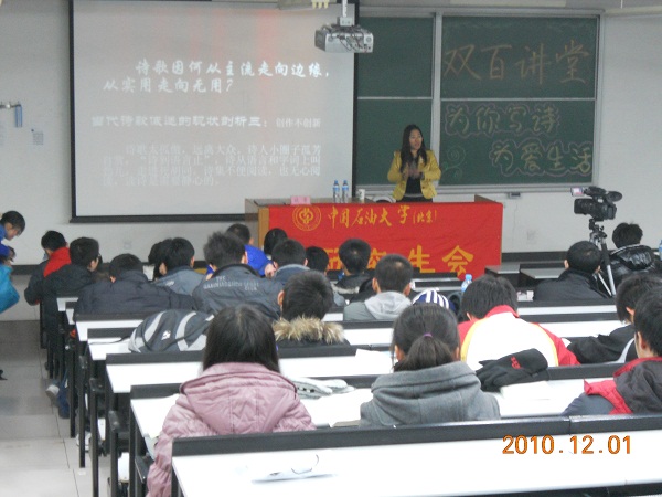 12月1日晚,中国诗歌学会理事、著名作家、诗人谈蓍做客中国石油大学双百讲坛,以“为你写诗,为爱生活”为题,为同学们带来一场精彩的讲座,本次活动由校团委、化工学院主办,校研会承办。