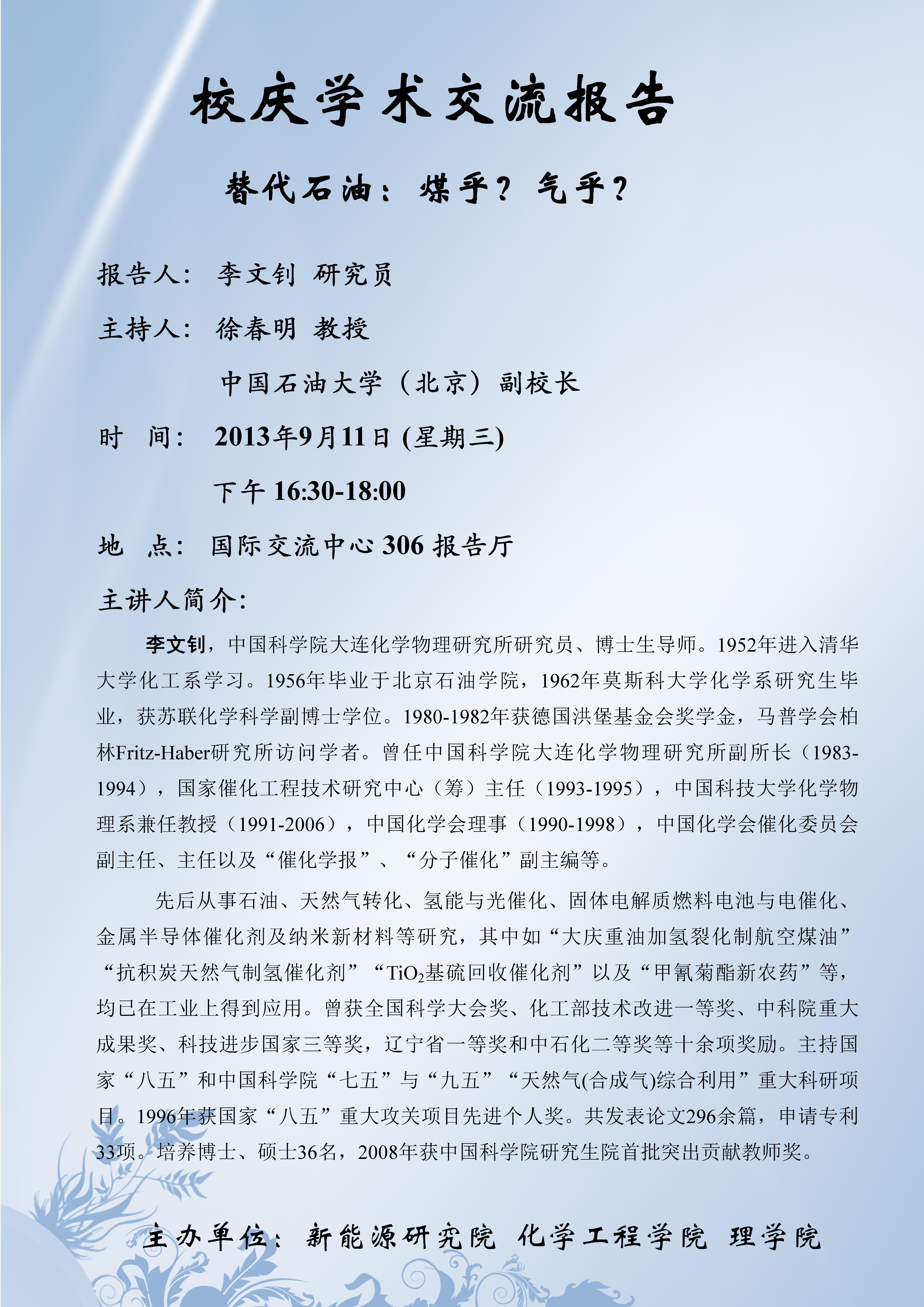 校庆学术讲座——替代石油:煤乎?气乎?(李文钊研究员)