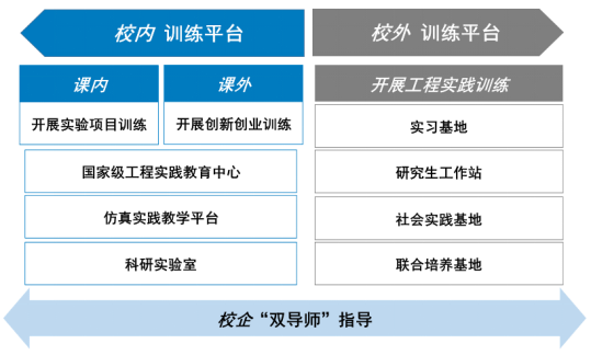 宏观方面,与企业共建了5个国家级工程实践教育中心和校内仿真实践教学平台、双创工作室以及高水平学科竞赛平台,开展工程实践创新训练。通过校企强强联合建设基地,形成了紧密的协同创新伙伴关系,将学校的学科及师资队伍优势、科研优势与企业的工程技术优势、技术专家队伍的优势有机结合,推进了企业深度参与人才培养过程。