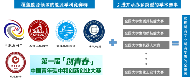 开展“多学科联合创新创业实验室”建设工作,组建由不同学科学生组成的创业团队102个,促进优势学科资源与创新创业实践相结合。建设覆盖能源领域上中下游的能源学科竞赛群,拓展学科育人功能,进一步增强“以赛代练”实效。2016年以来举办了中国石油工程设计大赛、全国大学生勘探地球物理大赛、全国油气地质大赛、中国海洋工程设计大赛、全国能源翻译大赛、新能源创新创业大赛和全国大学生营销创意与实践大赛共计22次,累计吸引10万余名全球学子、4000余名专家教授和200余个国内外高校、科研院所参与,产出专利、论文成果近70项。