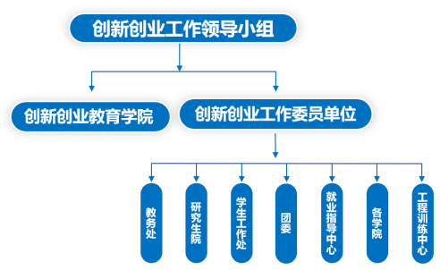 成立创新创业教育和教学工作领导小组,13个相关职能部门围绕主线统筹联动,打造校院两级创新创业工作体系。2022年成立中国石油大学(北京)创新创业教育学院,作为学校大学生创新创业工作专门的机关职能部门,在学校大学生创新创业工作领导小组领导下开展工作,牵头统筹、安排、协调、考核、评估全校大学生创新创业工作。教务处、研究生院、学工处、团委、就业指导中心、工程训练中心及各学院作为创新创业工作委员单位指导、监督及协助创新创业教育学院工作。各学院成立就业创业工作小组,打造校院两级创新创业工作体系,统筹开展学生创新创业工作。