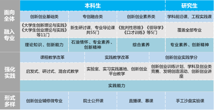 学校坚持服务国家能源战略、创新驱动发展战略和“一带一路”倡议需求,深化创新创业教育综合改革,将“推进创新创业教育,加强学生创新创业能力培养”作为主要任务列入了“十三五、十四五”规划,以立德树人为根本,围绕创新人才培养使命,立足行业特色和学科优势,培养具有石油情怀、专业素养、创新精神、实践能力和国际视野的能源领域高层次创新创业人才,为国家和地方经济社会发展提供人才支撑、技术支撑、文化支撑和思想支撑。学院围绕“增强学生创新能力,强化学生创业意识”的这条主线,把握“改革人才培养机制和建立产学研协同育人体系”两个支撑点,通过打造“全方位”特色教育平台、“全覆盖”创新训练平台、“全天候”创业实践平台和“全过程”文化引领平台四个平台,形成了“一线、两支撑、四平台”的创新创业实践育人体系。