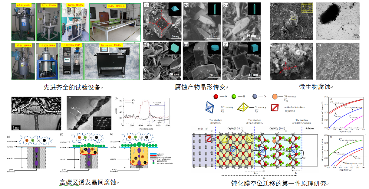 重点开展油气装备用材料腐蚀与防护、寿命预测与评估以及智能检测方向的研究。针对石油、天然气开发过程中的腐蚀问题,特别在高温高压H2S/CO2腐蚀领域,开展了材料腐蚀评价、腐蚀机制与寿命预测、防腐蚀技术及应用等研究,研究成果为高酸性油田的工程开发设计、选材方案与优化、寿命评估、防腐蚀技术应用提供了理论和技术支持;同时也推进了耐蚀合金管材、高抗硫耐腐蚀管材以及抗硫油气开发装备等重要装备的国产化进程。针对油气田腐蚀,开发了多种环境友好型缓蚀剂;针对大气腐蚀,开发了气相缓蚀剂、防锈油等防腐蚀技术;针对石油装备微生物腐蚀,开展了微生物腐蚀机理研究,对环境友好型抗菌材料和灭菌剂进行了开发。针对长输管线阴极保护和杂散电流腐蚀,进行了其机理及排流方式的探测。