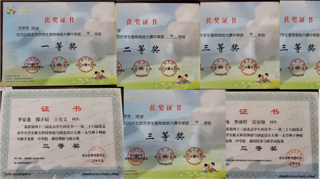深耕必有回响,在学院的支持下,附中科技教育取得扎实成效。2025年,由学院教师指导的生物社团在北京市多项竞赛屡获佳绩,累计获一等奖1项、二等奖1项、三等奖5项。