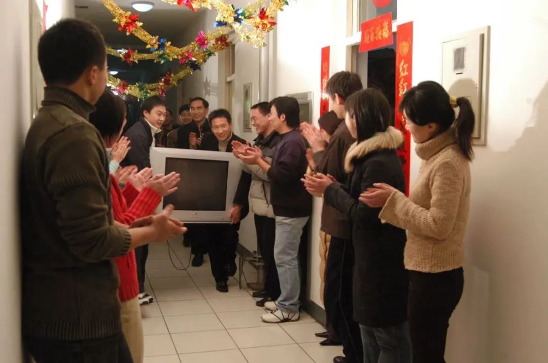 2005年除夕校领导李秀生、吴小林与留校学生在润杰宿舍包饺子。