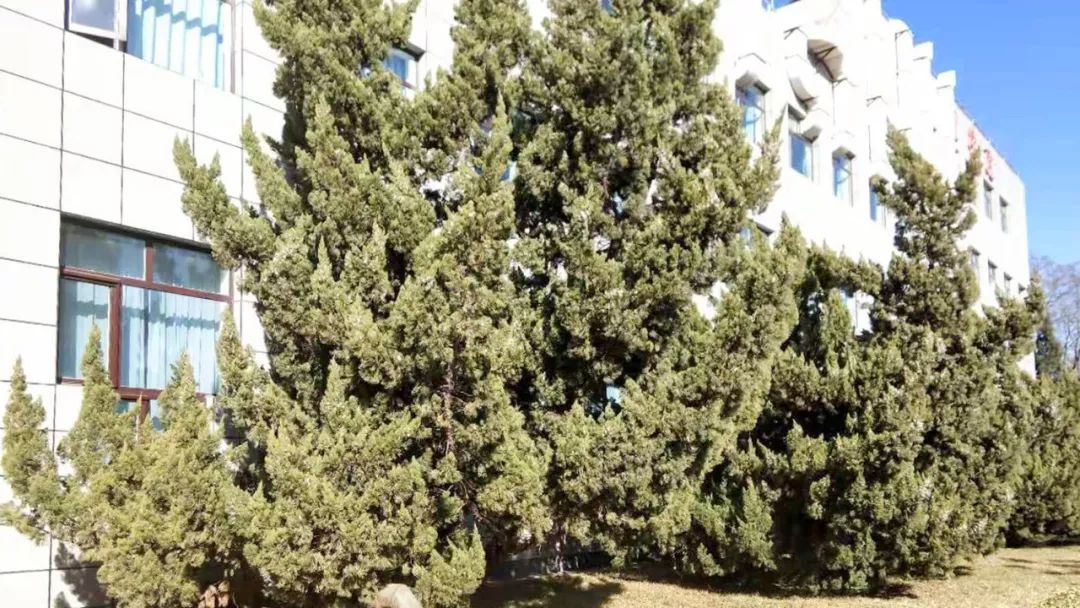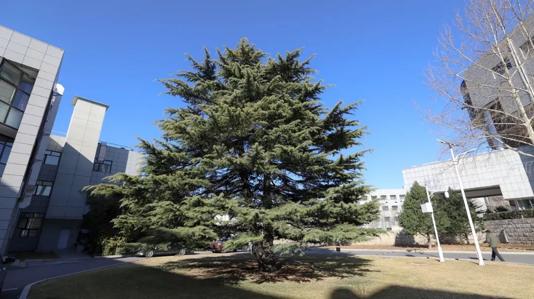 上世纪90年代,引进了几株雪松,现长势最好的一棵当属图书馆西侧的同株双生雪松。