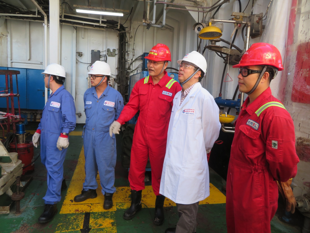 刘书杰 (右二) 在“南海四号”钻井平台查看作业情况