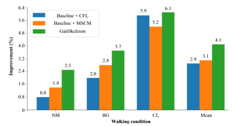 从图8中可以看出,MSCM在不同条件下持续提高了识别准确率,当MSCM应用于Baseline时,在NM条件下提高了1.4%,在BG条件下提高了2.8%,在CL条件下显著提高了5.2%。如图7所示,MSCM提高了几乎所有角度的识别准确率,特别是在CL条件下大角度(大于或等于90°)的情况下。这主要归功于MSCM提取的多尺度特征包含更丰富的判别信息,比单尺度特征更有效地捕捉步态模式,并且肢体尺度和姿势尺度特征分别关注区域和全局运动模式,从而平滑了低质量关节引入的噪音。