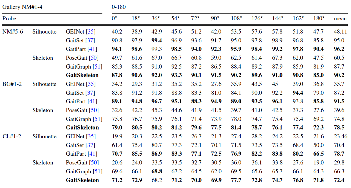在CASIA-B数据集上表现如表1所示,GaitSkeleton方法能在不同条件(即正常(NM)、背景(BG)和穿着(CL))有效提升步态识别的准确性。与基于模型的方法相比,在NM、BG和CL条件下,GaitSkeleton相比GaitGraph具有2.5%、3.7%和6.1%的识别准确率提升,可以看出GaitSkeleton在BG和CL条件下展现出最显著的改善。这可以归因于其减轻外观影响并提取高度具有区分性和稳健性的步态特征的能力。与基于外观的方法相比,在CL条件下,相比GaitPart,在在0°、108°和180°角度处,GaitSkeleton分别实现了0.5%、0.8%和5.3%的识别准确率提升。与GaitSet相比,GaitSkeleton在NM和BG条件下的识别准确率较低。然而,在CL条件下,GaitSkeleton超越了GaitSet,在180°处实现了21.8%的最大改善。这些结果突显了与基于外观方法相比,GaitSkeleton对服装和视角的优越稳健性。