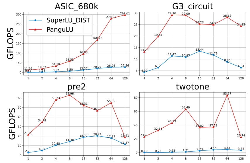 图6 SuperLU_DIST和PanguLU在128个A100GPU上的性能对比