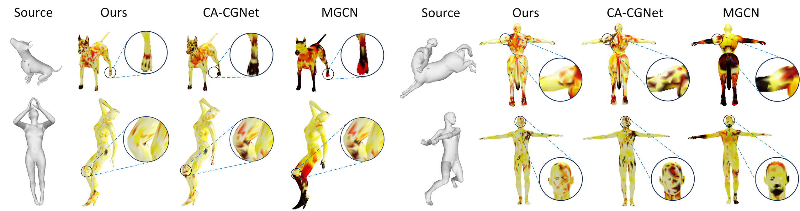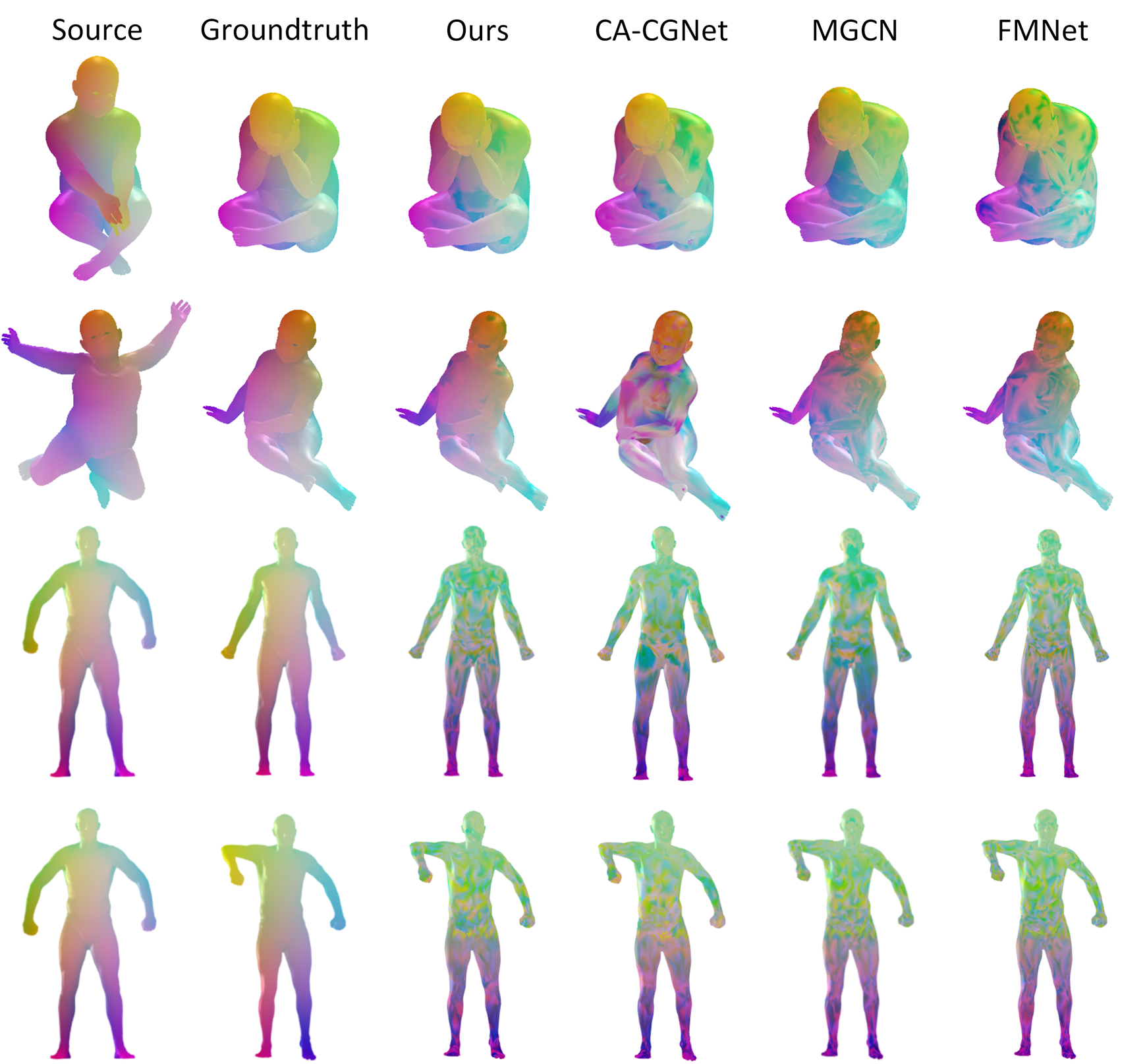 图4 各种方法在KIDS和SCAPE数据集上的形状匹配结果可视化