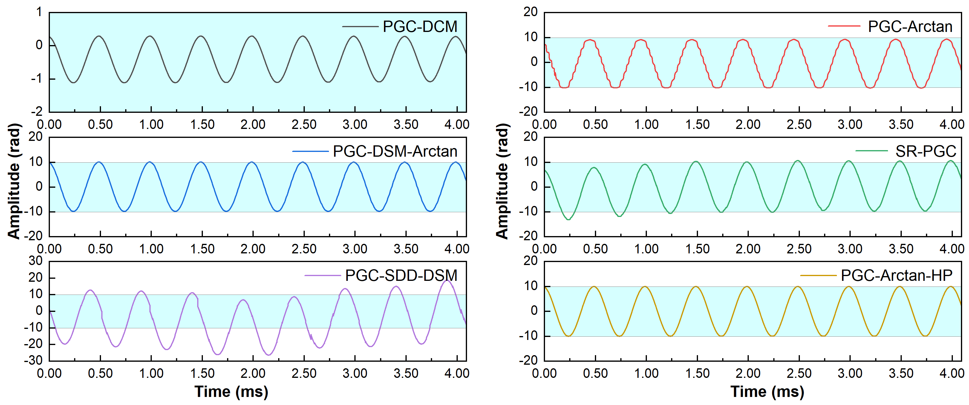 实验结果及性能对比如图3、图4和表1所示,相比之下,本文所提出的PGC-Arctan-HP算法能有效恢复待测相移信号。信噪比相比于PGC-DCM算法提升了30.7616 dB,相比于PGC-Arctan提升了21.6386 dB,能够有效提升干涉系统的性能。