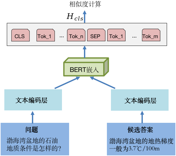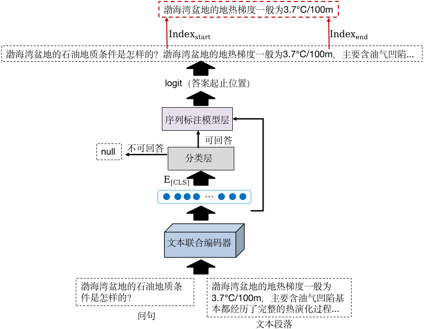 深度语义匹配模型的结构如图4所示。首先,将问句和候选段落利用BERT预训练语言模型进行联合嵌入,获得的编码向量中融合了上下文的语境信息;然后,将编码序列首位[CLS]标记对应的向量作为聚合序列表示,训练分类器判断在该段落中问题是否存在答案;对于段落中不存在答案的情况,直接将答案设为空值;对于段落中存在答案的情况,利用序列标注模型进行词级别预测,确定答案在段落中的起止位置,抽取出对应的文本子序列作为答案。