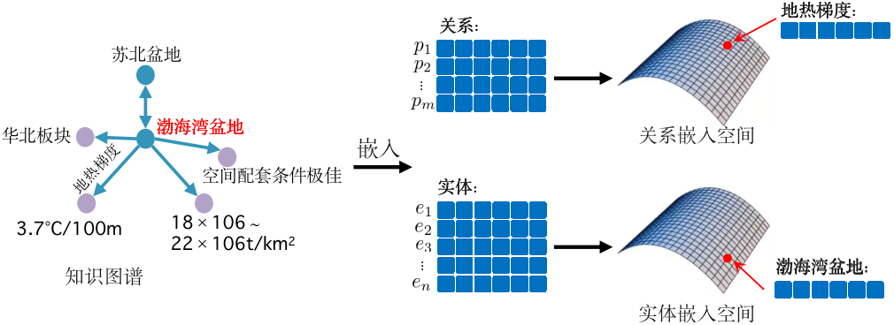 图嵌入如图2所示,将知识图谱中的实体和关系映射到高维向量空间。而知识图谱与文档信息的融合如图3所示。通过将知识图谱中实体“渤海湾盆地”“18×106~22×106t/km2”“3.7℃/100m”等表示与段落表示中的对应词的表示进行融合,增强了段落语义信息。其中,首先分析问句得到含油气盆地知识图谱中的对应子图;然后通过预先训练好的TransE嵌入模型得到问题对应知识图谱中实体的向量表示;最后使用自注意力机制融合编码文本段落信息和实体信息,从而得到更新后的段落表示。