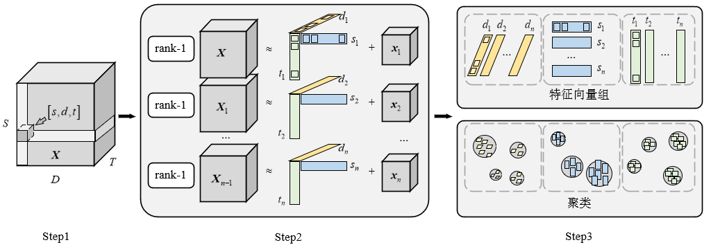 Step3,模式提取。通过连续秩1张量分解得到了多组低维向量,这些向量组都不同程度保留了原始三阶张量的特征。将每个张量中包含的3个一维向量按不同维度进行划分,得到描述不同维度特征的特征向量组。通过聚类方法对特征向量组进行聚类,可以得到综合参数在不同维度上更详细的时空模式。