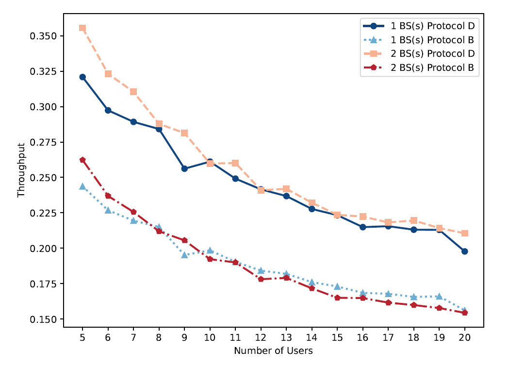 我们首先考虑对于单个无人机和1-2个基站的情况。用户随机分布在区域中,并进行100次实验,其平均吞吐量如图2所示。很明显,使用协议D的无人机吞吐量比使用协议B要高,相对于传统的转发中继协议至少提高了26.69%。