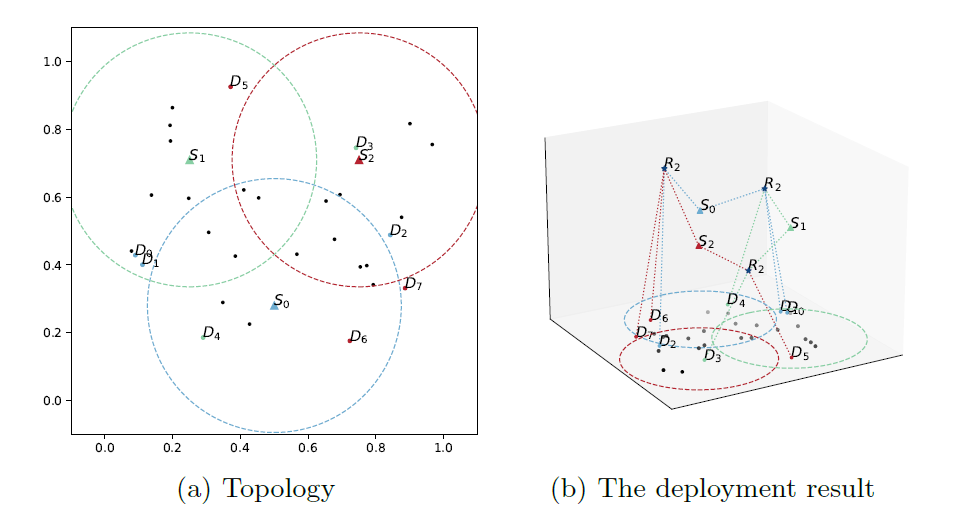 第二个实验重点关注无人机的部署问题。30个用户和3个基站随机分布在面积为1km2的正方形内,如图3(a)所示,其中用户用点表示,基站用三角形表示。需要连接的用户和基站用同一种颜色标记了。我们使用 3 架无人机作为中继。 图3(b)说明了无人机的部署。