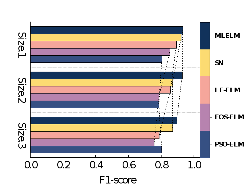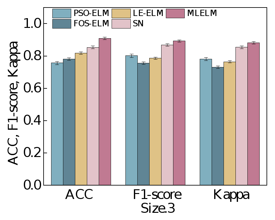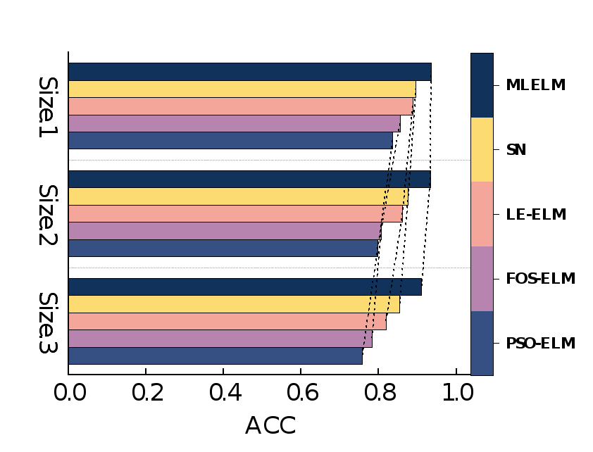 综上,根据上述实验结果可以看出,本章所提出的MLELM在处理电潜泵稀缺样本的故障分类方面优于ELM、PSO-ELM、FOS-ELM、LE-ELM和Siamese Nets。结果表明,MLELM可以有效地解决在稀缺样本下故障分类问题。此外,实验说明了将元学习方法与ELM相结合后,提高了模型在处理稀缺样本时的故障诊断性能。