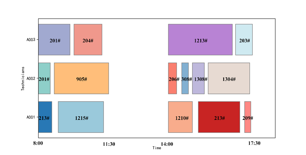 图3显示了未采用双层优化方法的现场应用结果。不同井簇的任务用不同的颜色来区分。现有技术人员3人,高级2人,初级1人。重要任务23项,一般任务28项,紧急任务2项。为了便于区分,不同的数字和不同的颜色代表不同的实际井簇。每个集群有多个任务,属于同一集群的任务在图3中用相同的颜色表示。