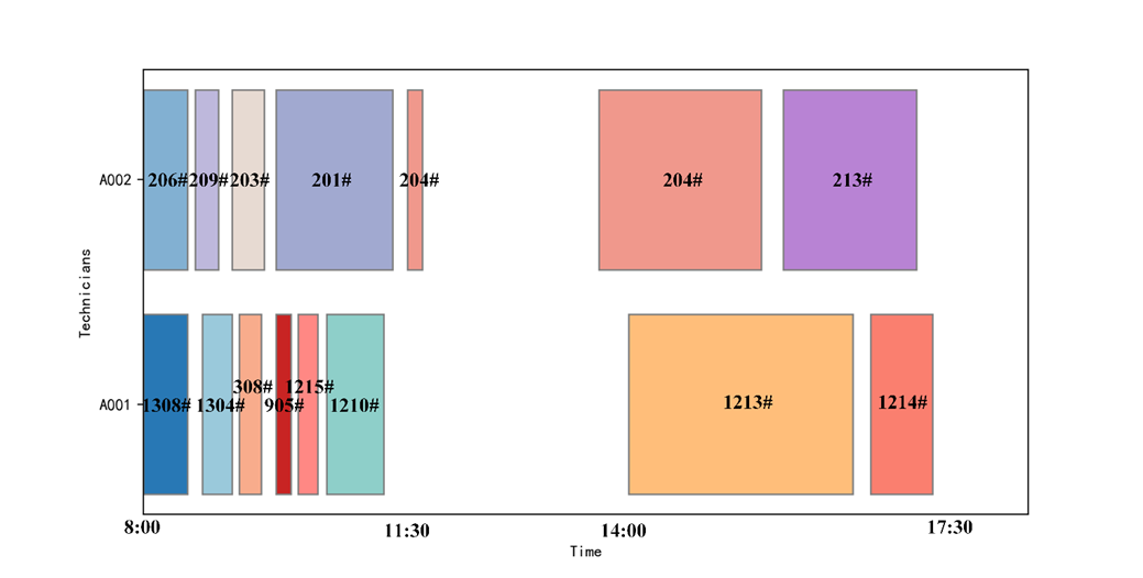 每位技术人员的工作时间为上午8:00-12:00,午休后13:30-17:30。