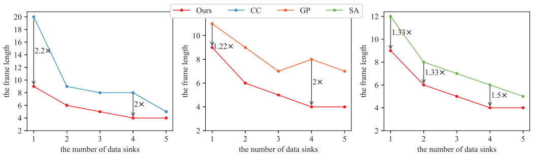 我们还将所提出算法与模拟退火(SA)算法及现有的BA-PDNOMAWNs多数据基站部署算法如CC、GP进行比较。在仅有一个数据基站的非骨干无线网络中,我们的方法将上行帧长度分别减少了2.2倍、1.22倍和1.33倍。在BA-PDNOMAWNs中,我们提出的方法甚至可以将接入时延减少2倍。