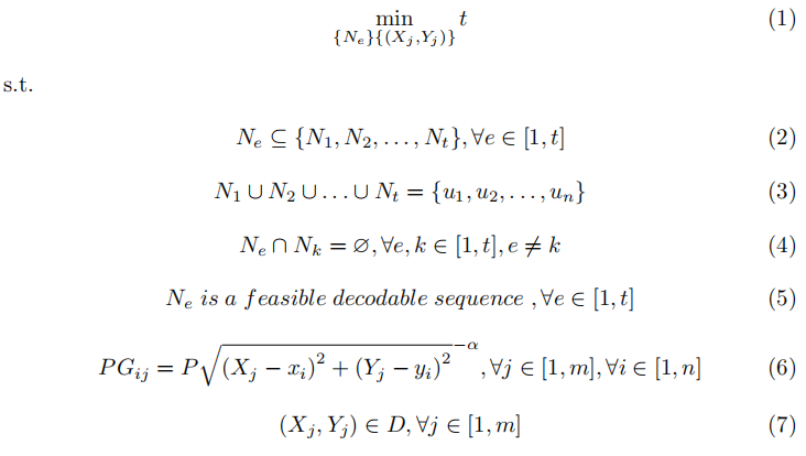 为了更清晰地描述问题,我们给出了“可行解码序列”的定义,对于一个拥有m个数据基站的BA-PDNOMAWN网络,我们需要找到m个可行的位置 (X1,Y1),(X2,Y2),…,(Xm,Ym) 来最小化帧长度。因此,该问题可以表述如下。