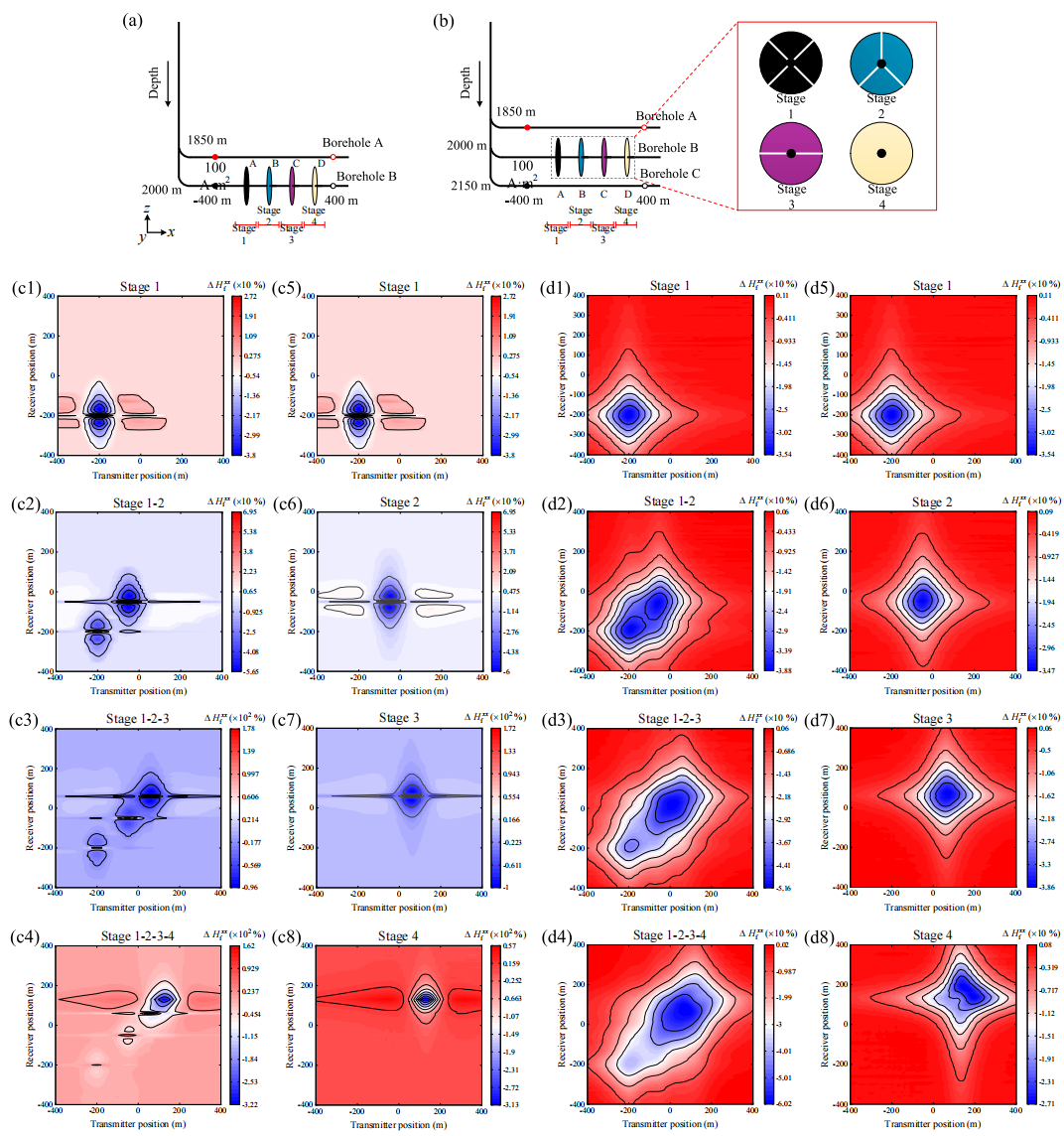 水力压裂一直是提高非常规页岩油藏产量的主要技术。水力裂缝几何形状的精确识别对于可靠的生产评估和预测至关重要。最近,井间电磁成像已成为绘制两个钻孔之间电阻率的可行方法。该技术已被证明是监测裂缝的有价值的工具,增强了对页岩变异性和流体前沿跟踪的理解,同时克服了检测深度的固有局限性。井间电磁感应测量通过在储层尺度上绘制井间区域来解决其他测井方法的局限性。因此,通过井间电磁感应技术探索水力裂缝特征具有至关重要的科学意义和实用价值。