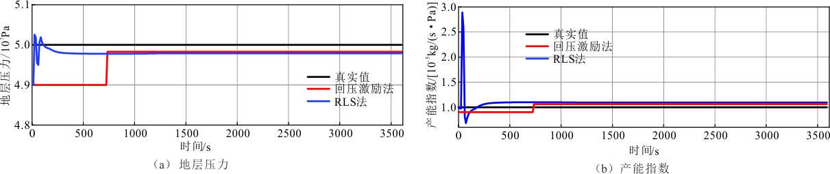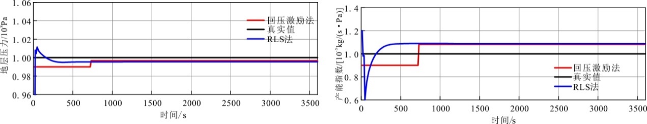 图6仿真结果表明:针对7000米深井,回压激励法仍能在检测到气侵发生后较快地反演出地层压力和产能指数,其反演精度仍高于RLS法。