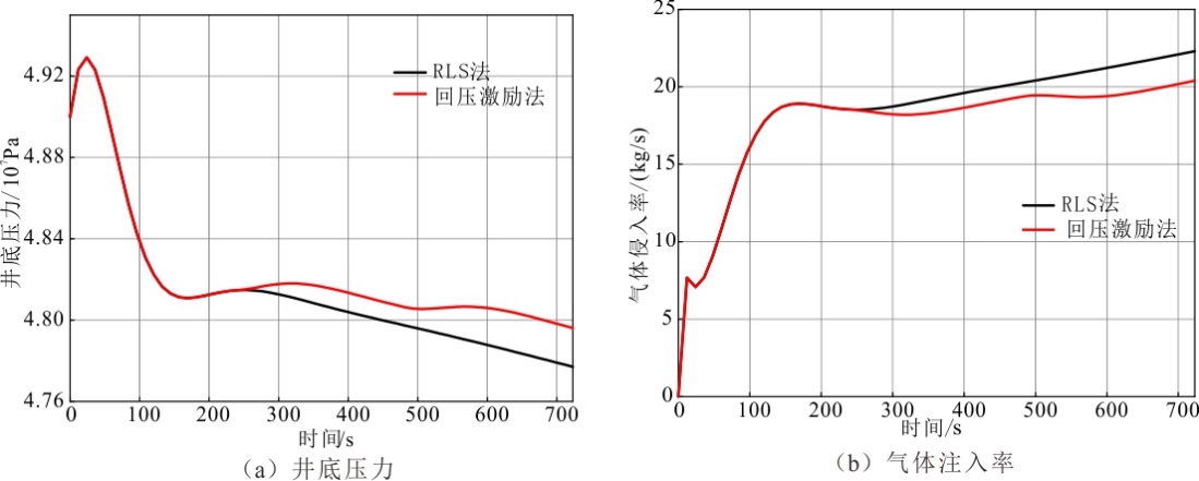图4仿真结果表明:两种方法均能在气侵发生后较快地反演出地层压力和产能指数,RLS算法反演速率略快于回压激励法,而回压激励法的反演精度略高于RLS法。由图5仿真结果可知:回压激励算法需要实时采集足够多的数据,在其采集数据期间无法进行地层压力的反演,导致其反演速度稍慢于RLS法。但因其在井口处施加了两次回压,采集数据期间一直有回压作用于井口,会减缓井底压力的下降和气体的侵入速度。可以看出,回压激励法在采集数据期间能加速气侵的衰减,一定程度上抑制气侵的进一步扩大。
