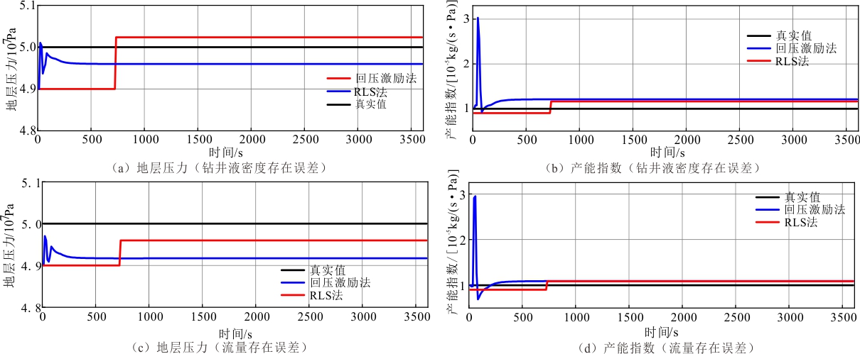 图7仿真结果表明:在钻井液密度和出口流量存在误差的情况下,回压激励法和RLS法均能准确地反演出地层压力,且回压激励法的精度略高于RLS法,其鲁棒性更好。这与回压激励算法中采用井底压力和出口流量的累积量来反演地层压力有关,利用累积量在一定程度上提升了回压激励算法的鲁棒性。