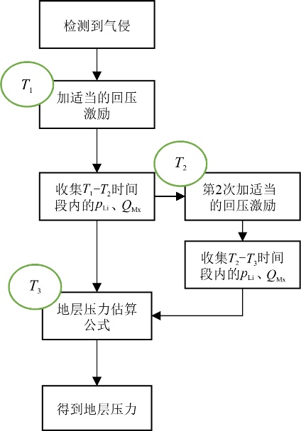 由非关井回压激励下的地层压力反演算法的整体流程(下图)可知:检测到气侵发生后,不改变泥浆进口流量,先后施加两次阶梯变化的回压值,作为井筒的外部激励。每次施加回压后的一段时间内实时采集气侵响应参数(井底压力和井口出、入口流量)。其中出、入口流量可利用MPD系统实时测量,井底压力的测量受限于气侵期间的信号传输问题,需利用简化两相流模型计算。将采集到的数据经过左矩形公式计算积分,分别代入式(23)得到: