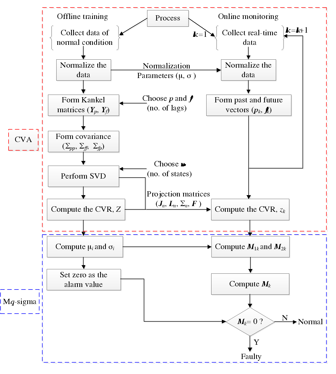 当化工过程中发生初始故障时,一些变量会略微偏离初始轨迹,过程残差会逐渐向均值的一侧偏移,即发生过程变异。传统的指标对这种情况不够敏感,或者以高误报率为代价来实现它。为了解决这一问题并探索在动态过程中具有低误报率的方法,首先通过规范变量分析生成规范变量残差。然后,提出了一种新的多变量q-sigma规则来监测规范变量残差。它在一个窗口中考虑上述过程变异,并为每个变量设置控制限。当在模拟过程中进行测试时,多变量q-sigma对过程变化非常敏感,能够比其他方法更早地检测出初始故障,即检测延迟和检测距离最小。