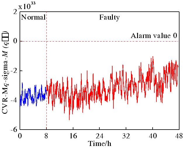 规范变量分析是监测动态过程的有效工具,该方法被用于用于生成规范变量残差,根据历史数据获得投影矩阵和各个规范变量的均值(期望为0)以及标准差。在线数据经过预处理,再根据投影矩阵生成规范变量残差。以移动窗口的方式观测每个残差是否有过程变异出现(即连续多个点超出控制限)。如果该窗口内的所有点都超出上界或者下界,一定有该窗口内的所有偏差(观测值与控制限的差值)均大于0或者均小于0,那么该窗口内的偏差和的绝对值减去偏差绝对值的和一定等于0。最后将所有被监测变量的信息融合在一起形成监控指标,并将0作为故障的报警值。只要某一个变量的某一个窗口出现过程变现,该指标为0并出现报警。