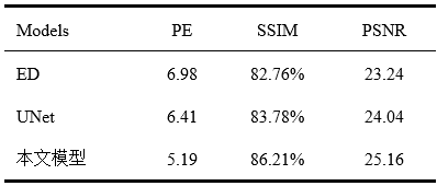 由于电成像测井无法获取完整全井眼数据,无法对空白带填充后的电成像的整体填充效果进行量化评价,因此本文首先对人为添加条形掩膜的自然场景灰度图像进行缺失值填充实验确保填充模型有效。本文将所提模型与编码器解码器模型(Encoder-Decoder,ED)与UNet进行对比分析,客观指标的量化结果如表1所示。相比UNet模型,本文所提模型的PE减少了19.03%,SSIM提升了2.9%, PSNR提升了4.66%,说明特征融合大幅度提升了相应的客观指标,验证了本文所提空白带填充模型的有效性。
