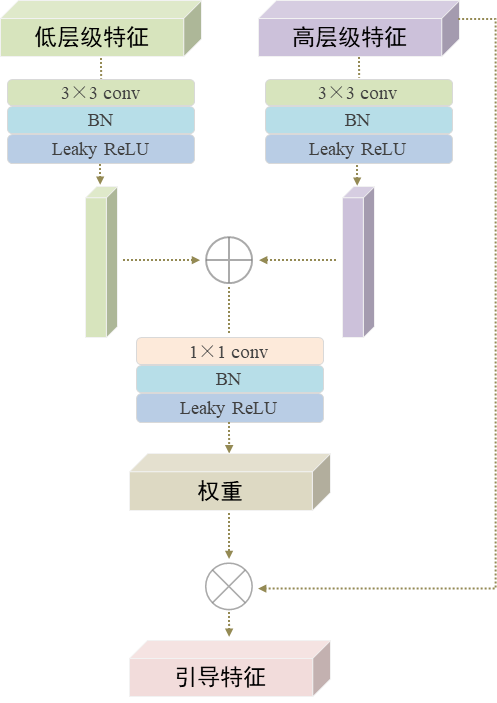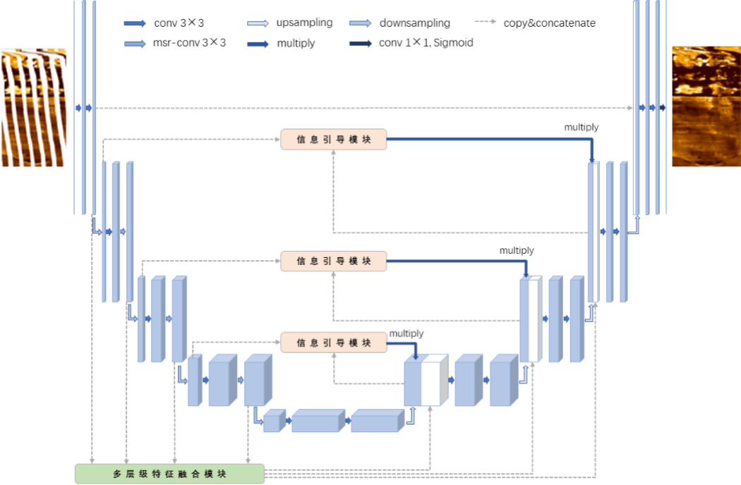 同时,在编解码特征连接环节引入多层级编码特征融合模块与信息引导模块,丰富上采样的特征尺度,减少解码过程中的信息丢失,具体细节如图6和图7所示。