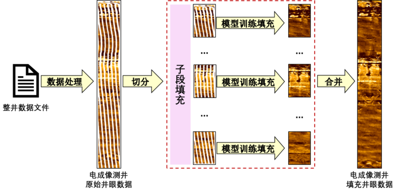 本文基于上述无监督填充方法提出一种端到端的填充全井段的电成像测井空白带的填充框架,填充模型采用UNet结构,融合了多尺度多层级特征,并且基于电成像测井的电阻率进行填充,无需复杂的转换图像的流程。填充框架如图3所示,填充模型如图4所示。