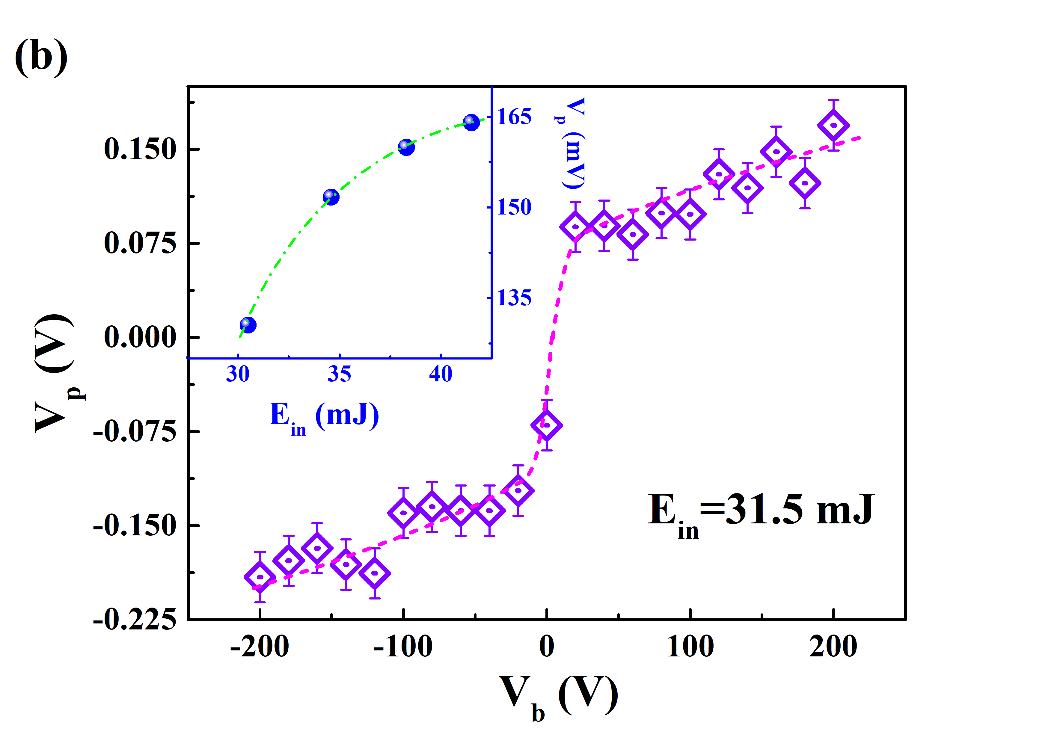 图1为激光辐照在样品上产生的LIV响应信号,随着偏置电压Vb和入射激光能量Ein的增加,信号的峰值(Vp)也会随着电极接收到等离子数目的增加而增大。