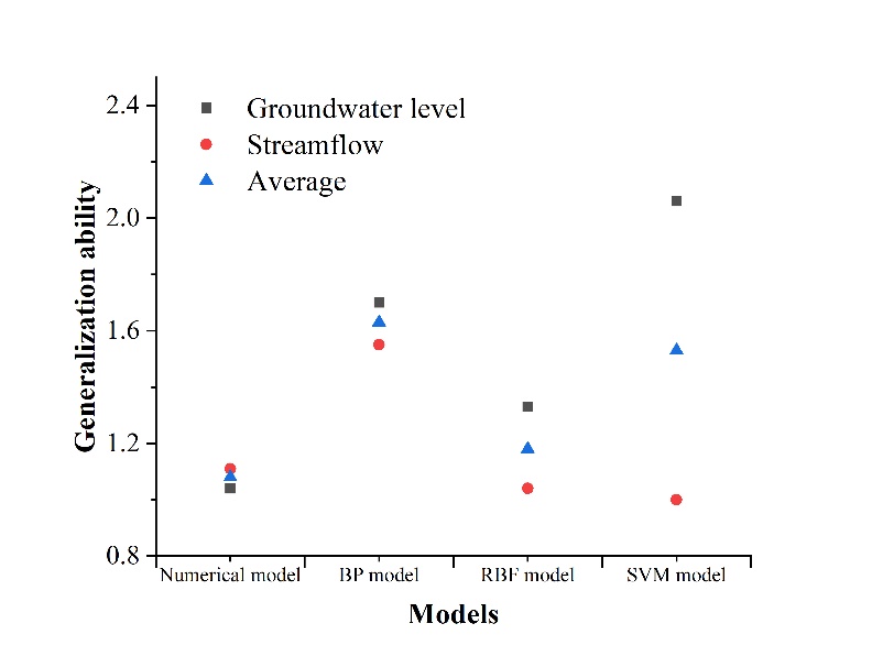 3. 实验结果。对模型计算时间、模拟精度、预测精度以及模型的泛化能力进行评价(见表1、表2与图2)。经过对比发现,相比于数值模型,机器学习模型消耗了更少的计算时间得到了更优的模拟精度与预测精度;而数值模型的泛化能力优于机器学习模型。因此,机器学习模型适用于对实时性要求高、需要多次运行模型且不必考虑物理机制的情景(如实时模型、敏感性分析、不确定性分析、优化等)。